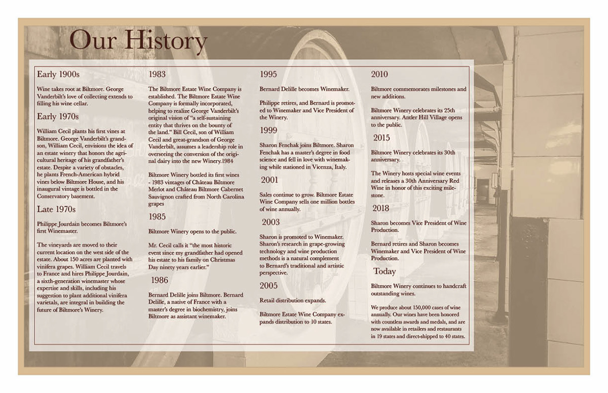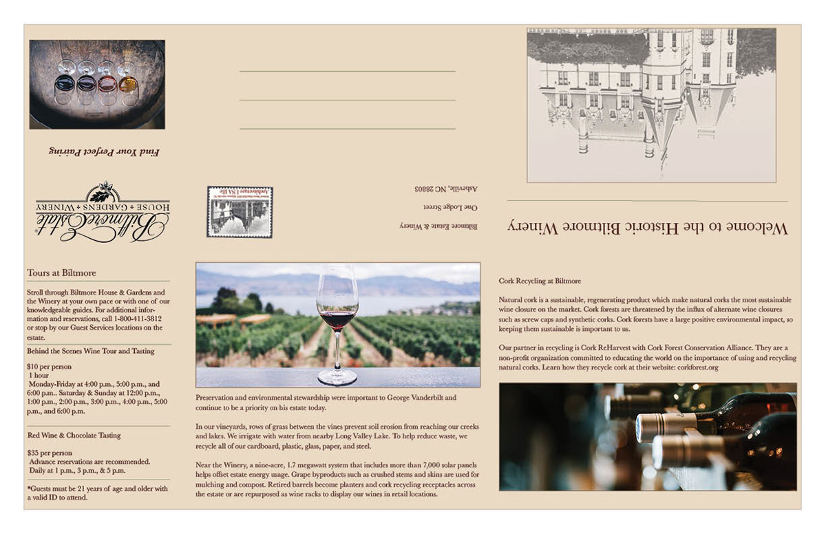 This brochure was created to advertise Biltmore Estates and Winery via mail. The color scheme, font choices, layout, and images were all chosen to represent Biltmore's historic and deignified brand.